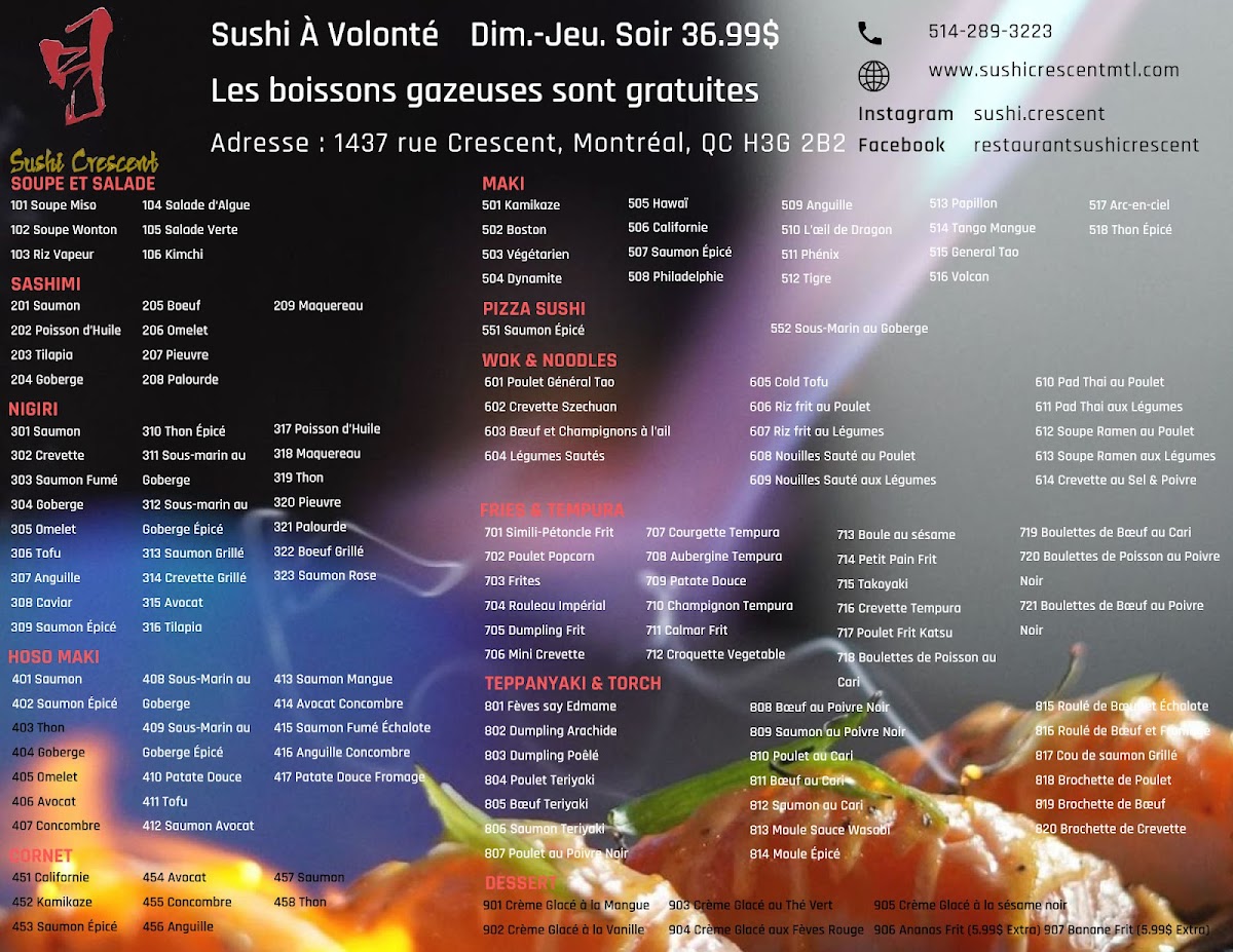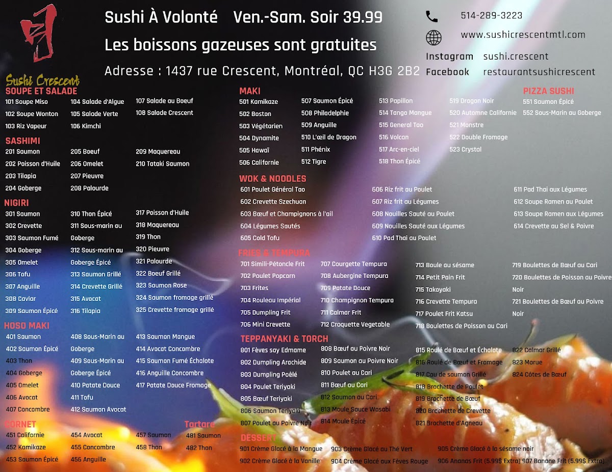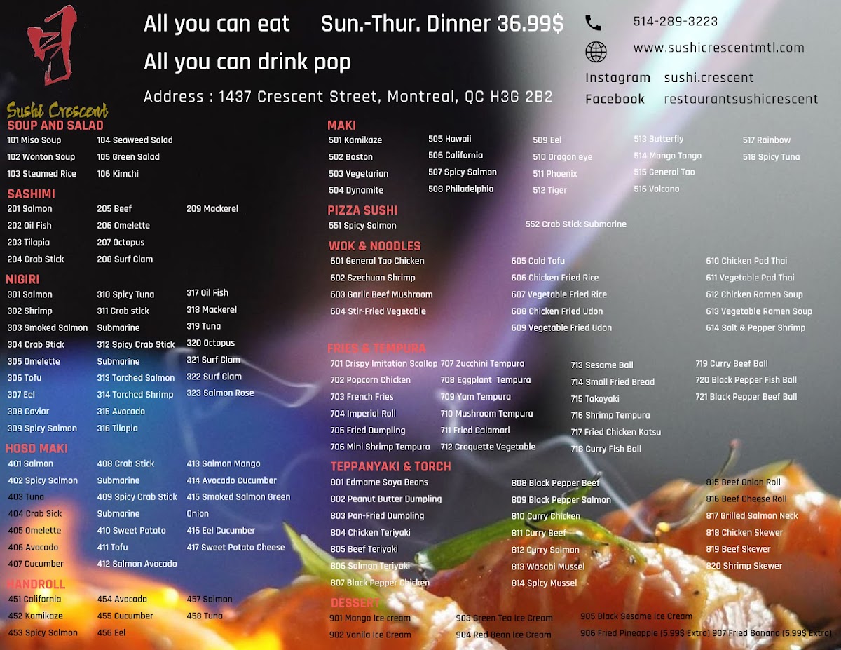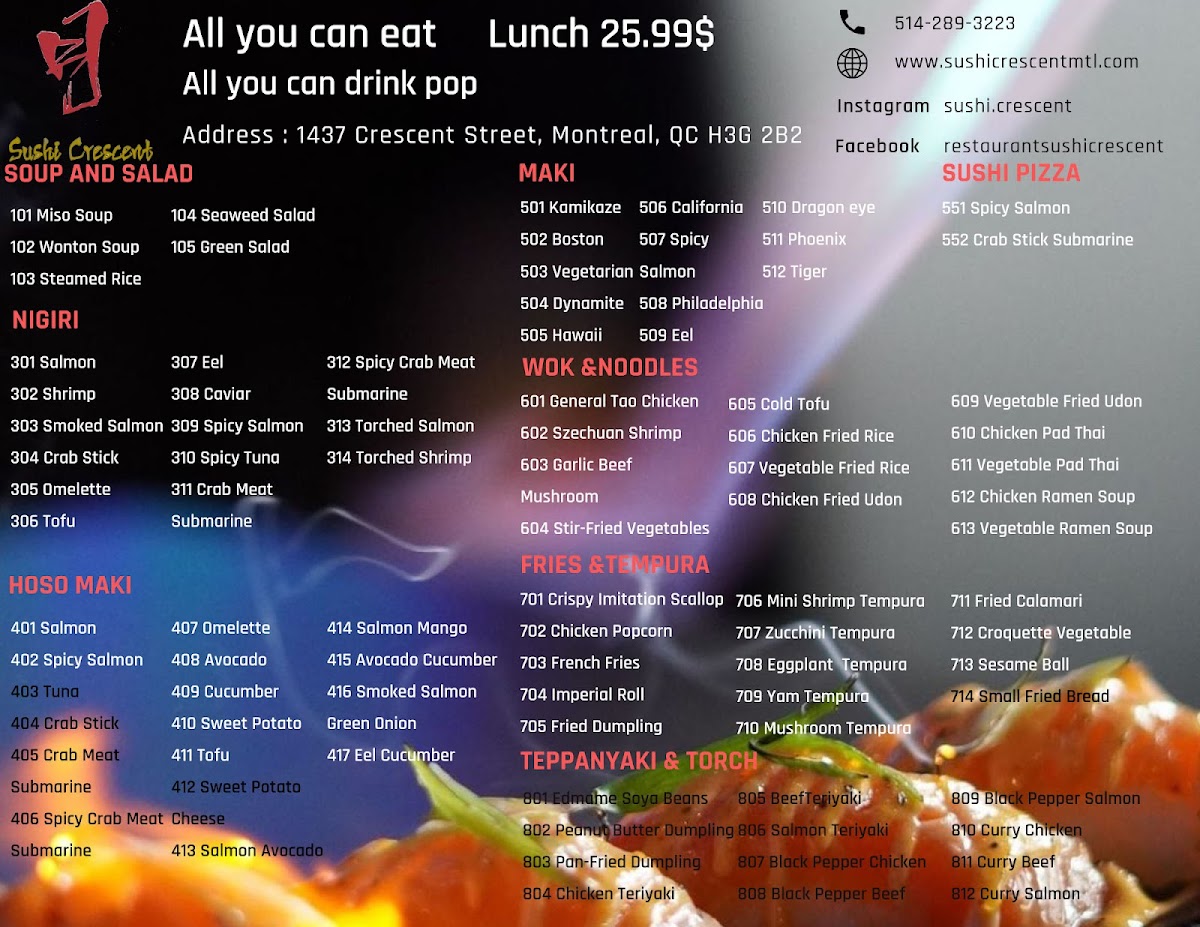 Welcome to Sushi Crescent, a sushi haven located at 1437 Crescent St, Montreal. Known for its vibrant atmosphere and mouthwatering assortment, this establishment offers an impressive range of sushi and Asian dishes. Whether you are craving Maki, fresh sashimi, or delectable hot dishes like Chicken Fried Udon and Teriyaki, there's something to delight every palate.
